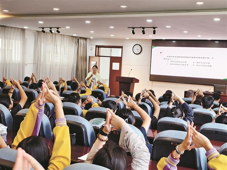 近日,沙河口区城管执法局联合西安路街道永顺社区在大连市第八中学组织开展了一场垃圾分类讲座。活动现场,团市委青年讲师、大连市垃圾分类讲师团特聘讲师通过生动有趣的视频教学,教大家如何正确进行垃圾分类,让孩子们对垃圾分类的重要性、分类方法有了全面的了解。 (大连新闻传媒集团记者 王煜 摄影报道)