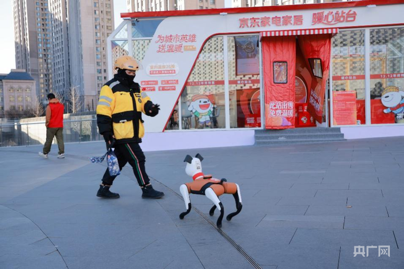 据了解,站台内不仅用多台品质取暖器营造舒适的室内温度,还设有AI下棋机器人,可与前来站台的人们进行免费的棋艺切磋,以趣味互动增添冬日温暖。与此同时,机器狗在站台周边灵活巡游,以科技感与亲和力吸引附近的一线劳动者和过往行人进站休息。不少外卖小哥被这份特别的“邀请”打动,走进站台喝杯热水、免费充电、领取暖冬礼包,短暂休整后再出发。
