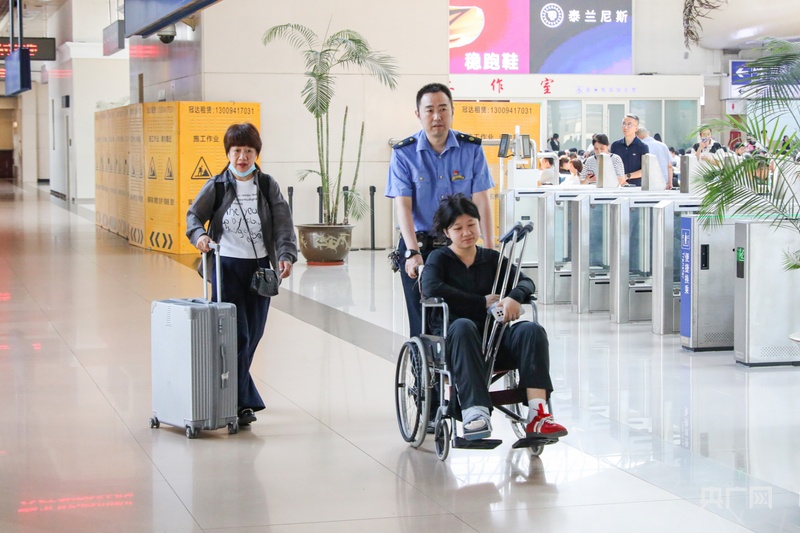 大连站工作人员帮助行动不便的旅客(央广网发 隋峰 摄)