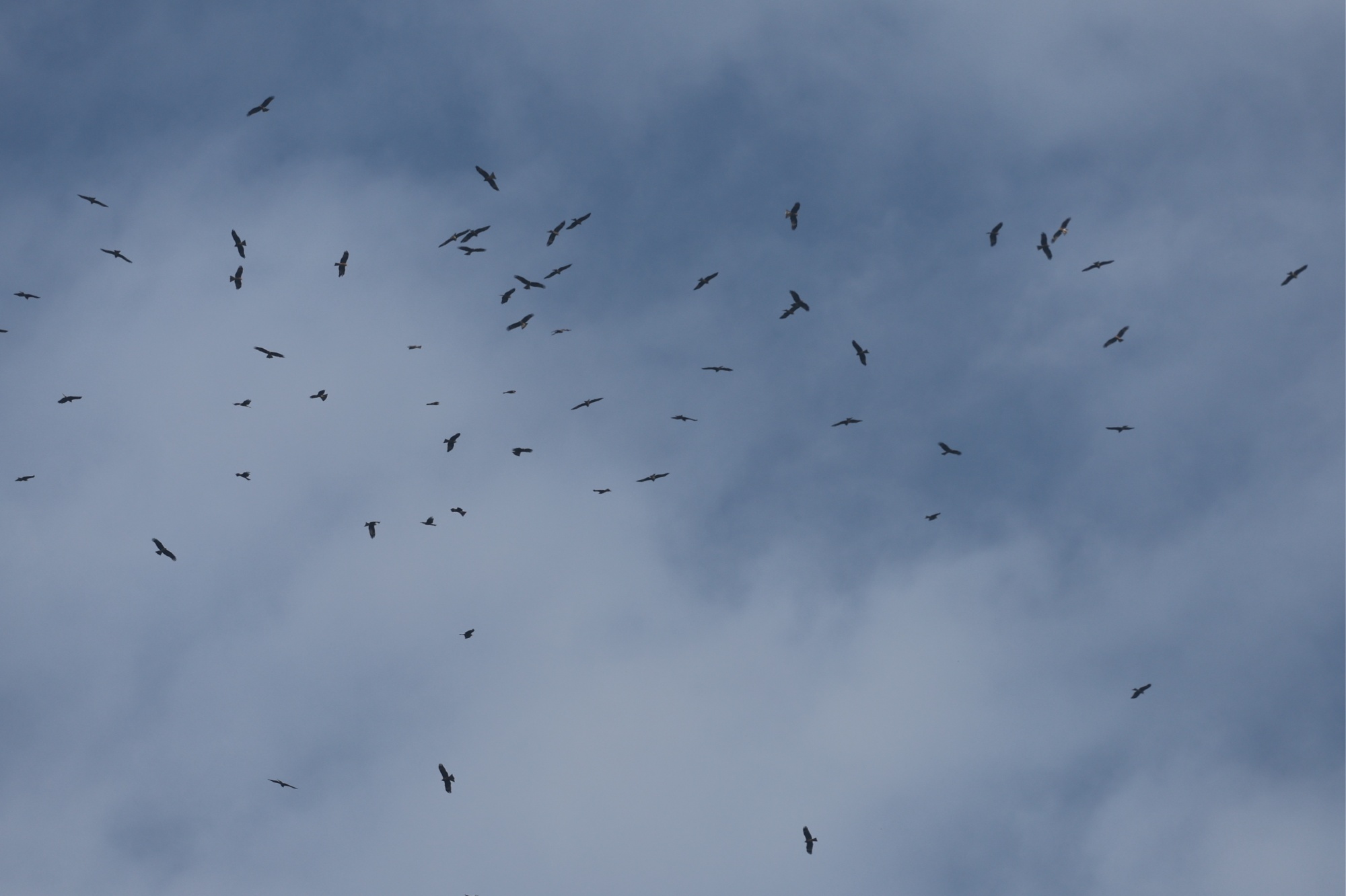 前期迁徙延后: 以赤腹鹰、凤头蜂鹰大群为代表,前期迁徙高峰较2023、2024年推迟约一周,与今年气温相对较高有一定的关系(去年“万猛日”在9月23/24日,今年在10月2日)。
