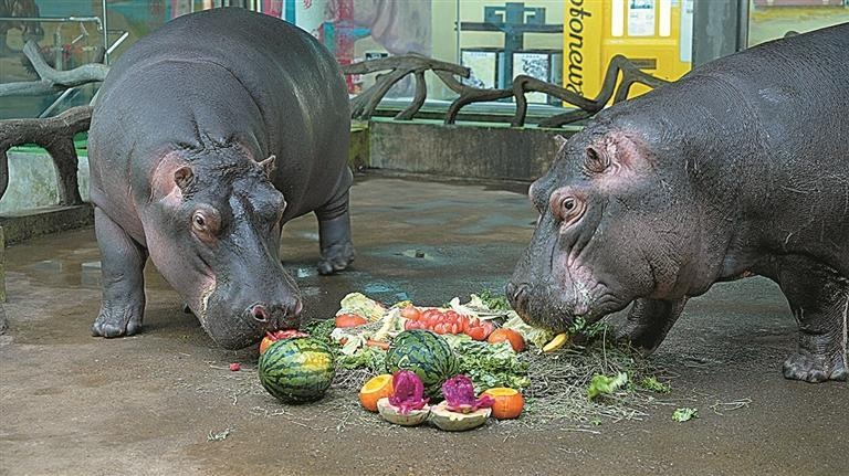 河马的“年夜饭”,搭配西瓜和南瓜。大连新闻传媒集团/大连云记者吉存 摄